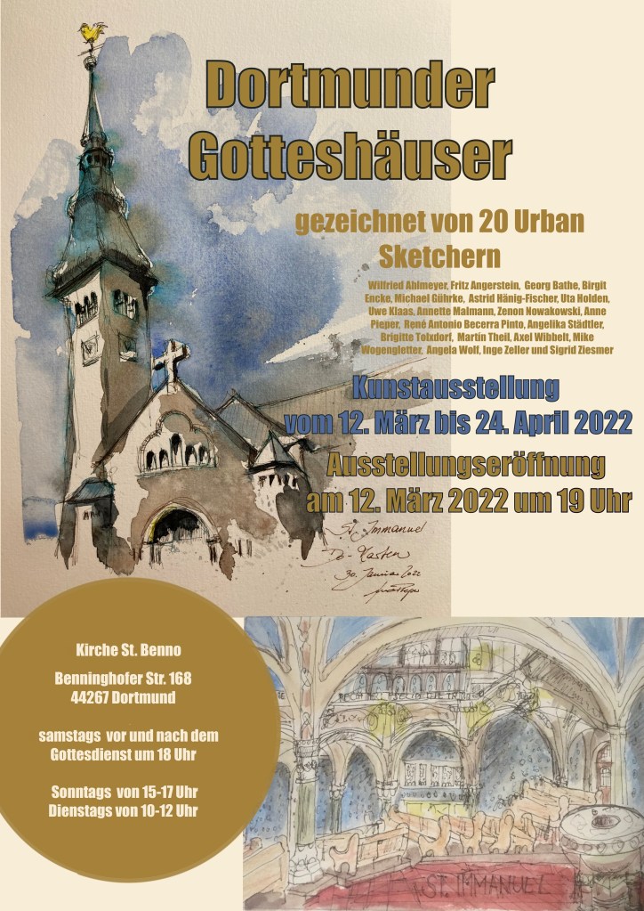 Bilder und Plakat der Ausstellung „Dortmunder Gotteshäuser“ in der Kirche St. Benno in Dortmund-Benninghofen